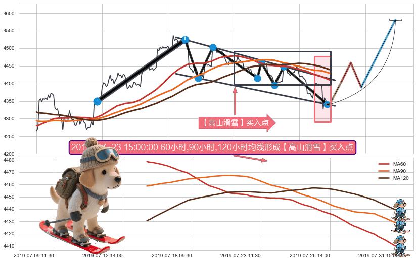 | 2 🅚:【高山滑雪】买入点 ➕ 🌊:波浪理论猜想下跌浪5已形成,猜想后续形成abc反弹上涨(均值回复) ☞ 看多信号 ⇥ 【均线】交织【图形】⇥ 综合量化分数: 61 | > |