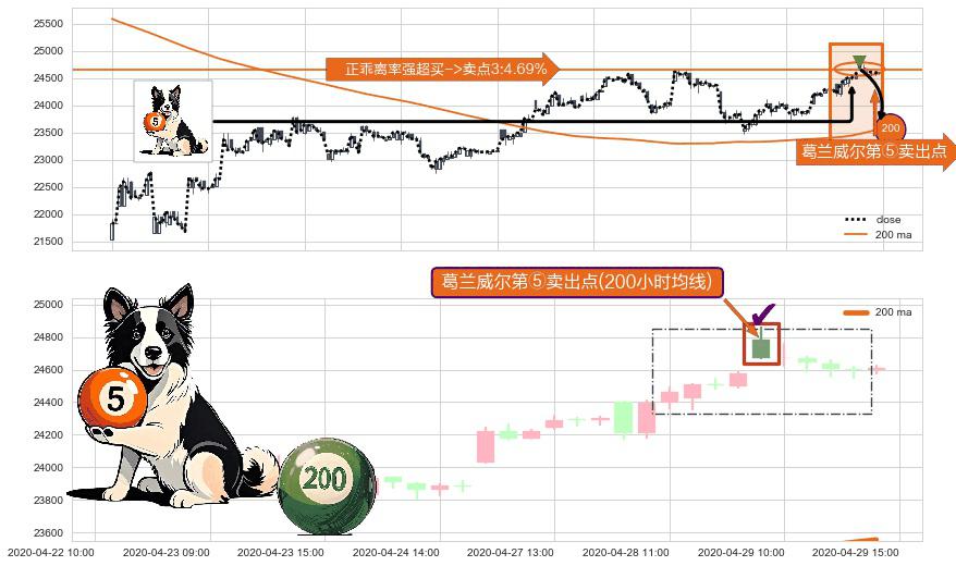 ⚀ 2020-04-29 09:00:00-小时显现 葛兰威尔均线 200小时均线 第⑤卖出点 上升趋势均值回复的短线回落信号,后市看跌,卖出信号