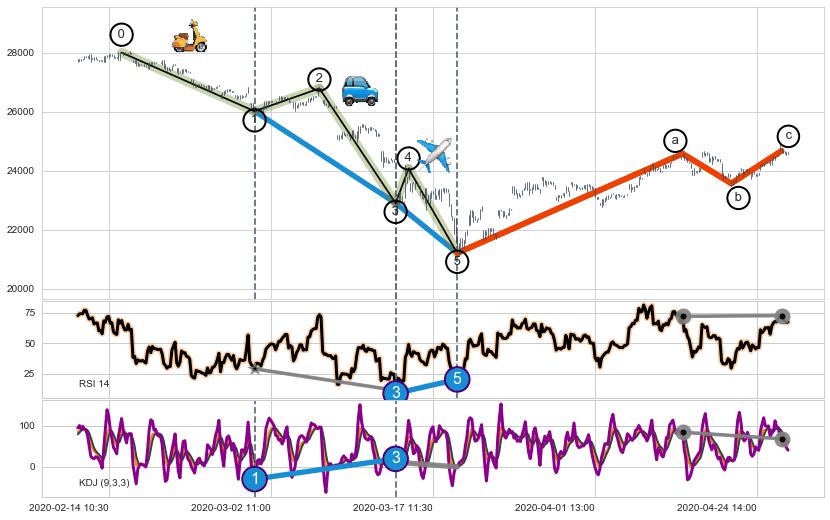 ➢ 1,3,5驱动浪MACD, RSI, KDJ走势都出现【常规背离】反转信号增强