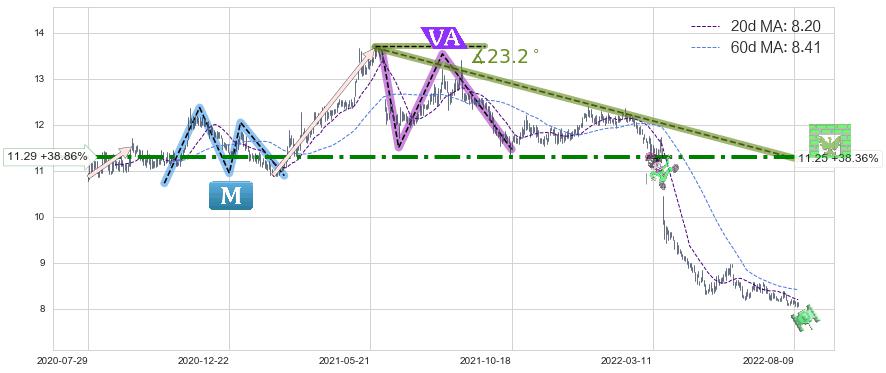 从2021-05-26至2022-08-12,共包含301个交易日,阶段股价下跌-48.83%,阶段股价变动位移路程比: 1 : 5,下跌趋势角度: 23.2,2022-03-22向↘︎形成缺口,跳空下跌-14.11%˚