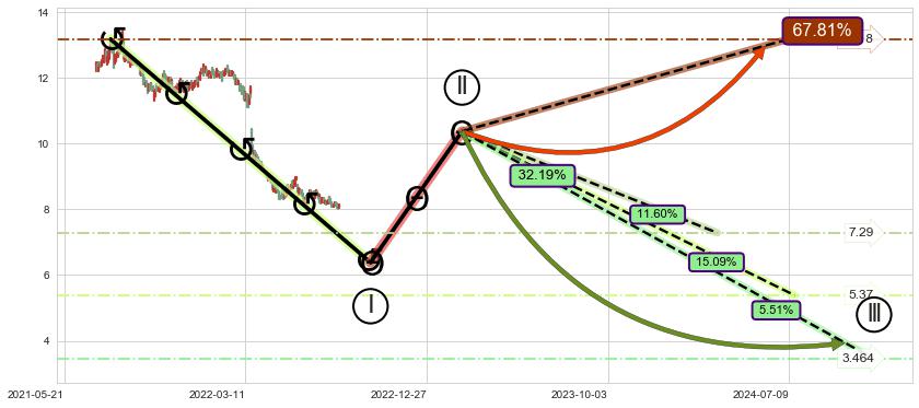 ➣ 5.1: 预测当前第5浪位置(2022-08-10, 8.06),仍然有下跌空间