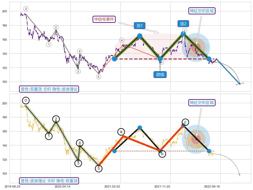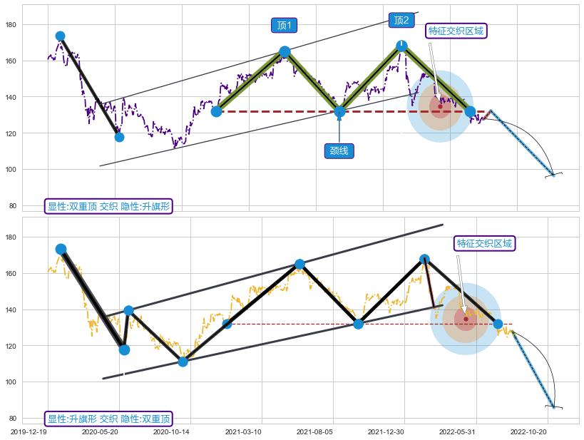 ➣ 双重顶:关键支撑位被击穿 → 猜想形成趋势持续下跌 → 风险信号 → 大趋势均值回复