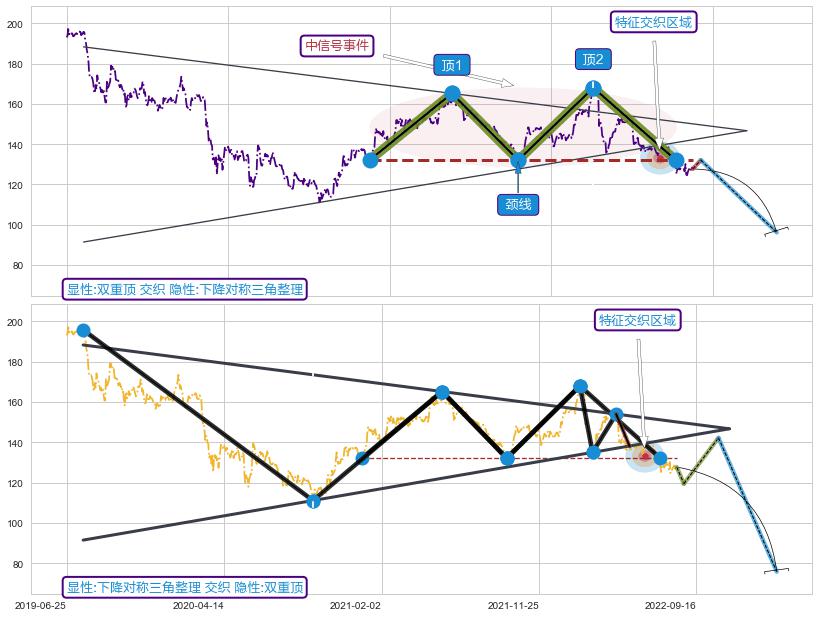 ➢ 双重顶属【中级别信号事件】下降对称三角整理属【长级别信号事件】中长周期组合信号事件,中长事件长度比54.68%