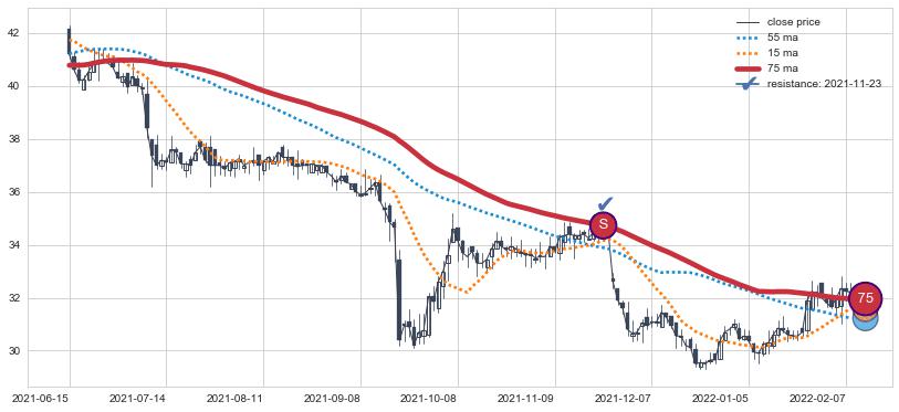 ➢ 75小时均线于(2022-04-19: 31.39)形成【死叉】基于【死叉历史模型】预测死叉后最低波谷价格: 28.82, 死叉后最低价格25.85,已经下跌超出预测最低波谷价格, 预期反弹