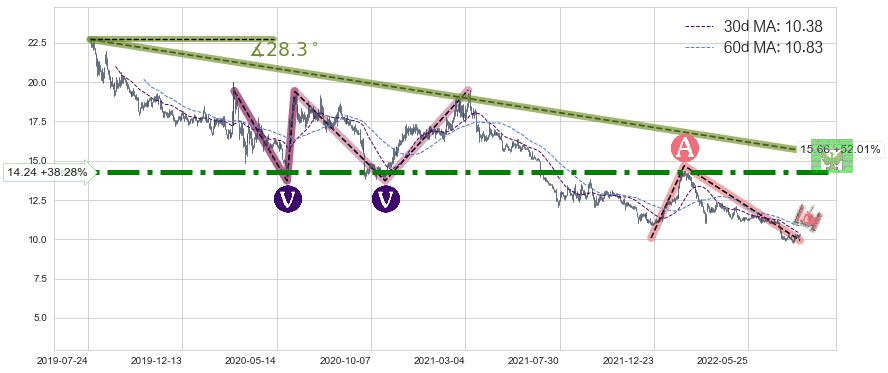 ♘ 阻力价格位14.24,可信任强度89.66%,距离最后交易2022-08-12形成的收盘价格10.30相差 +38.28%