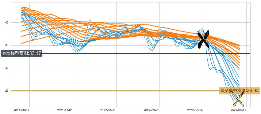 ➢ 60小时均线于(2022-06-14: 36.35)形成【死叉】基于【死叉历史模型】预测死叉后最低波谷价格: 33.18, 死叉后最低价格22.05,已经下跌超出预测最低波谷价格, 预期反弹