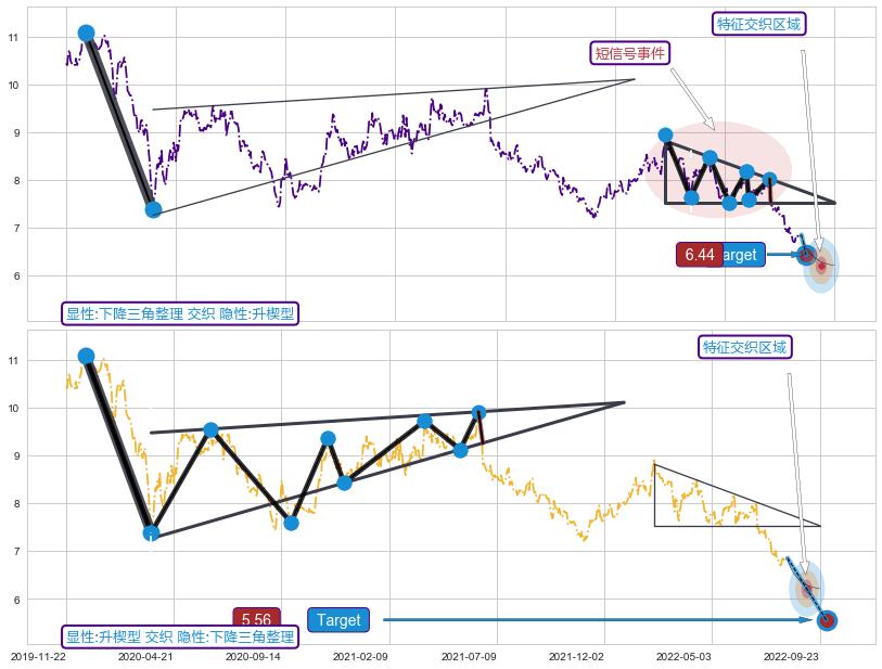 ➣ 高档五阴线 + 下降三角整理支撑破位转换阻力下跌信号叠加后【目标达成率】低,【看空】信号叠加【存续影响大】