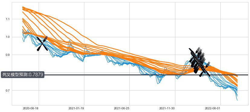 ➢ 120小时均线于(2022-03-23: 0.8163)形成【死叉】基于【死叉历史模型】预测死叉后最低波谷价格: 0.7437, 死叉后最低价格0.6400,已经下跌超出预测最低波谷价格, 预期反弹