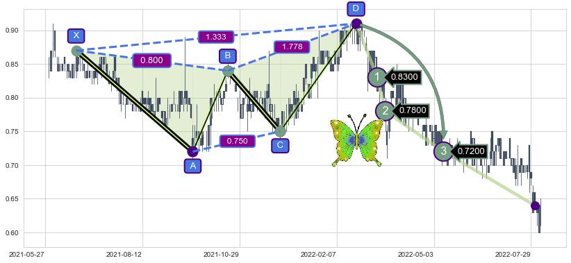 ➣ 已完成【蝴蝶】形态起点X: 2021-06-23, 终点D: 2022-02-21, 共145交易日
