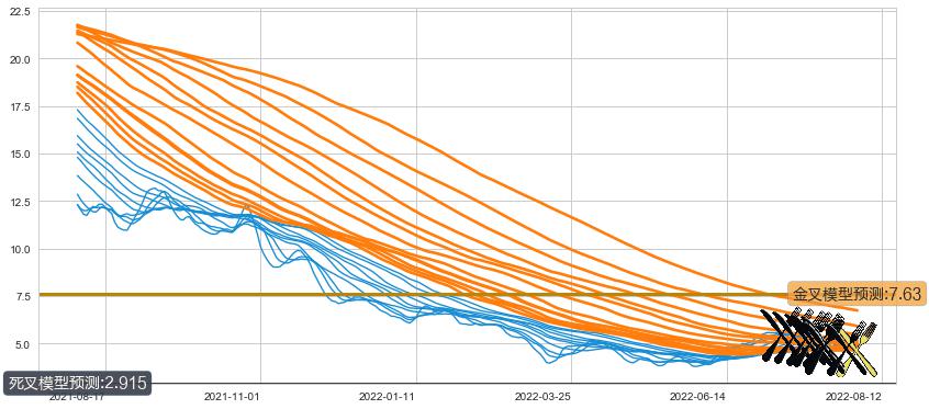 ➢ 70小时均线于(2022-08-08: 4.70)形成【死叉】基于【死叉历史模型】预测死叉后最低波谷价格: 2.916, 死叉后最低价格4.50,尚未达到预测最低波谷价格, 预期继续下跌
