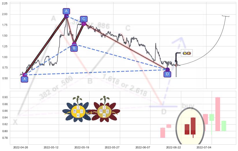 ➢ 谐波蝙蝠:c下跌到达d:猜想拉升 → 上涨 →【拐点】强支撑临近 → 大趋势均值回复