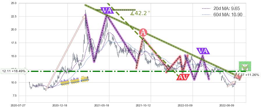 ♘ 阻力价格位12.11,可信任强度74.53%,距离最后交易2022-08-12形成的收盘价格10.22相差 +18.49%