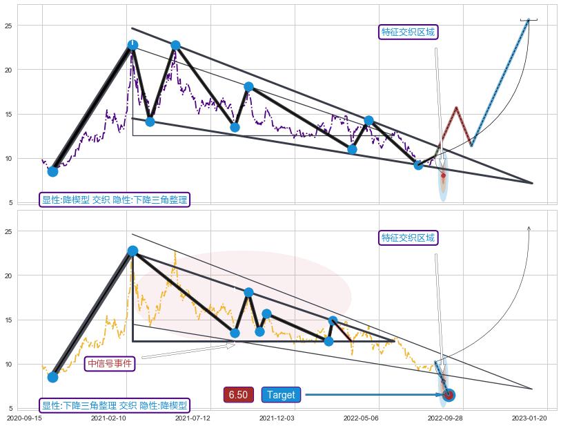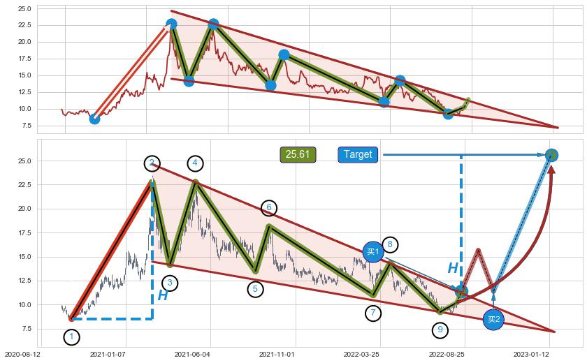 ➣ 下降三角整理:猜想下跌target达成后 → 上涨 → 机会信号 → 大趋势均值回复