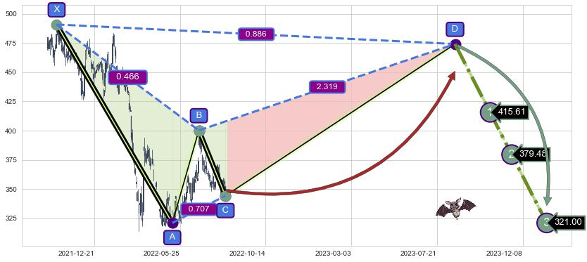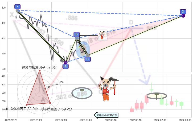 ➢ 未完成【蝙蝠】形态起点X: 2021-10-20, 已到达C点: 2022-08-10, 预测最终D点: 2023-08-21, 共466交易日