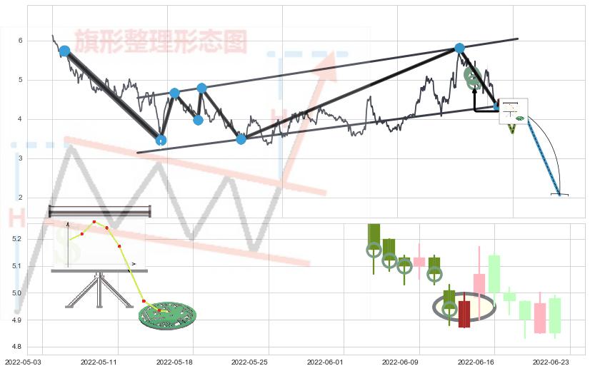 ➢ 看跌(高位倒锤头)流星线 🔜 升旗形临近支撑猜想转换阻力下跌 综合量化分数:47.62 【中性】