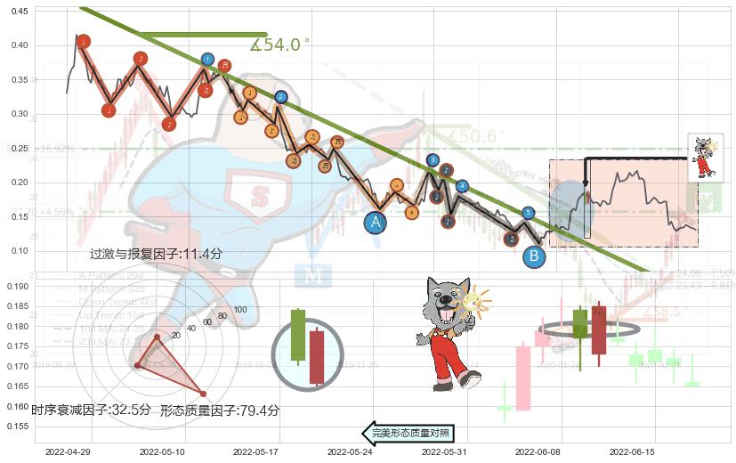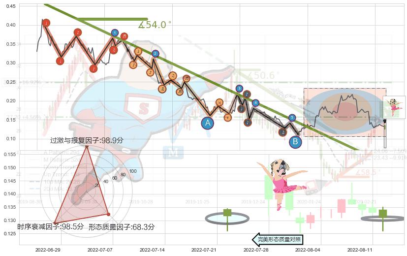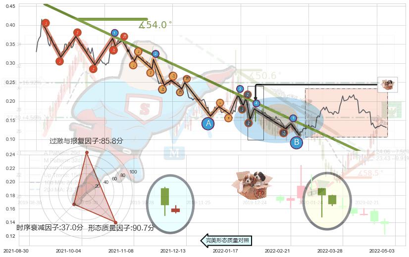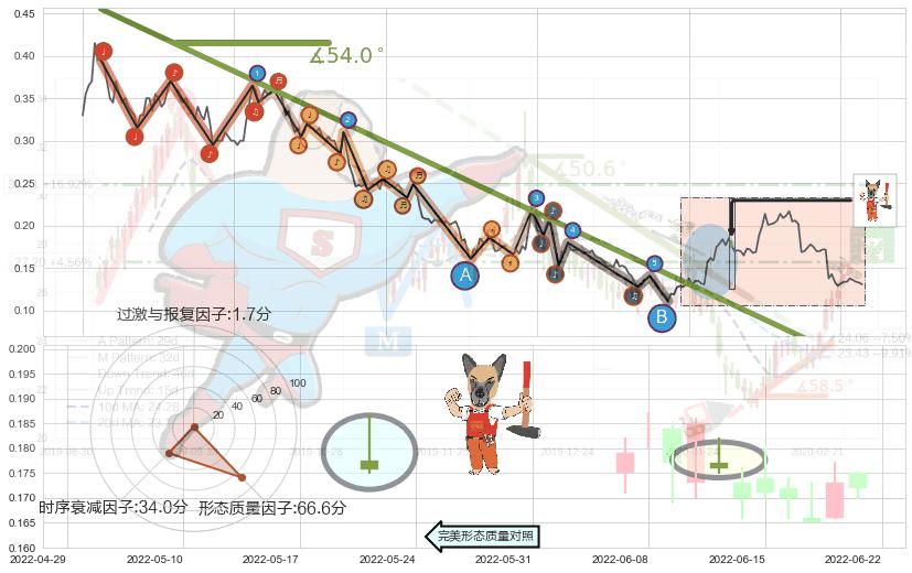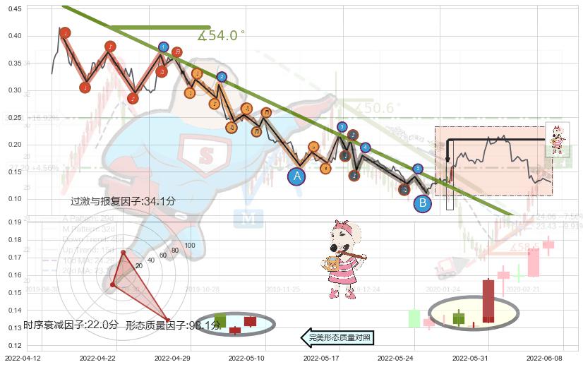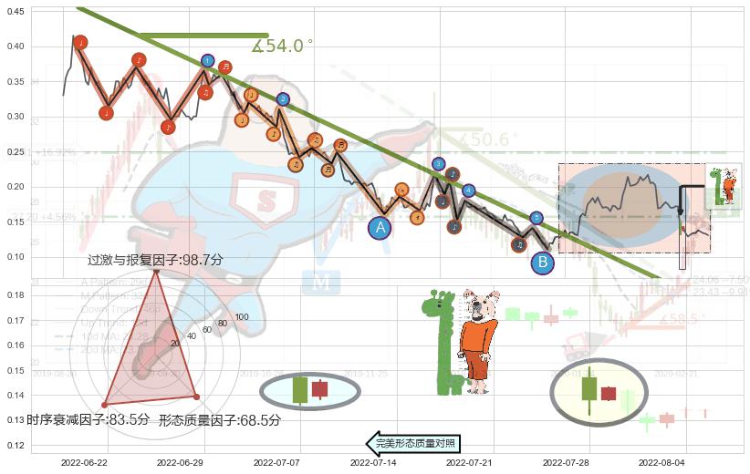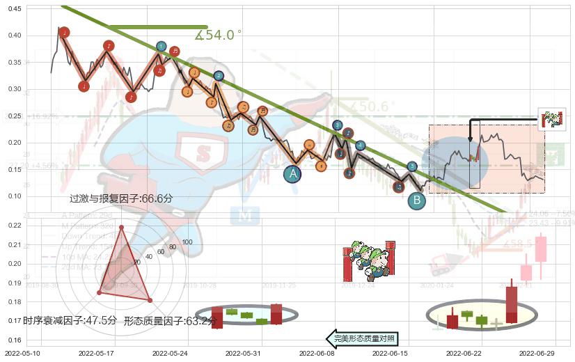 从2021-08-04至2022-05-20,共包含194个交易日,阶段股价下跌-93.95%,阶段股价变动位移路程比: 1 : 6,下跌趋势角度: 54.0