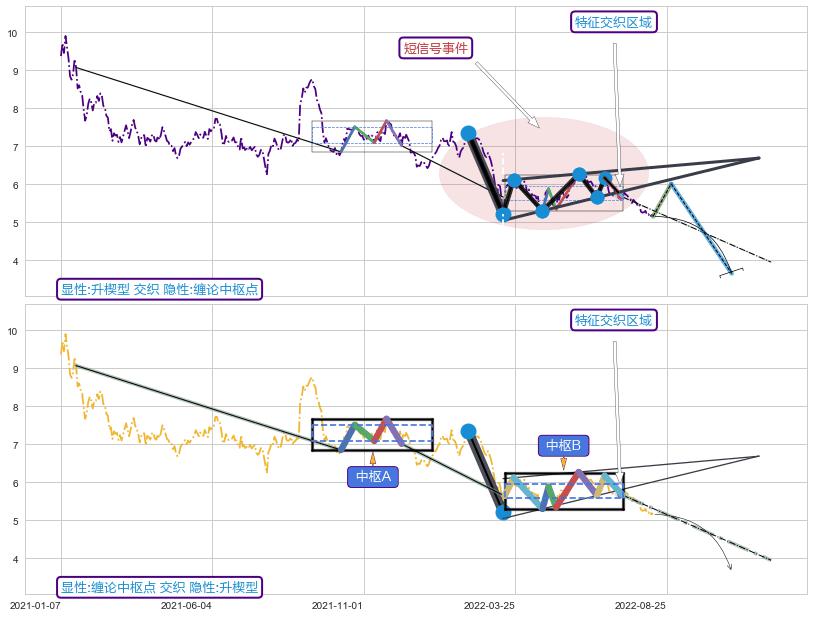 ➣ 缠论中枢点:猜想破位中枢B后持续下拉 → 下跌 → 破位中枢B支撑 → 持续趋势跟踪