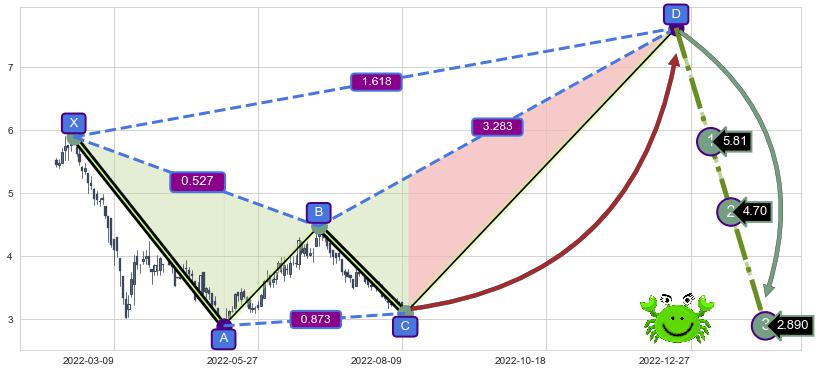 ➣ 未完成【螃蟹】形态起点X: 2022-02-17, 已到达C点: 2022-08-10, 预测最终D点: 2022-12-20, 共209交易日