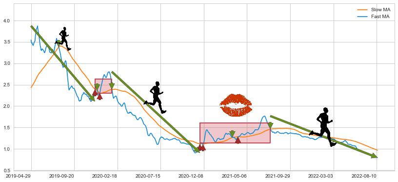 2021-07-26至2022-08-12 慢线与快线呈空头排列, 慢线与快线接触少,无缠绕