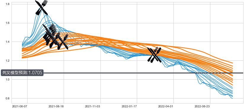 ➣ 120小时均线于(2021-07-30: 1.4088)形成【死叉】基于【死叉历史模型】预测死叉后最低波谷价格: 0.9262, 死叉后最低价格0.7900,已经下跌超出预测最低波谷价格, 预期反弹