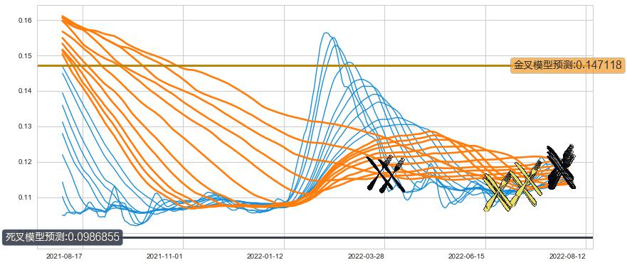 ➢ 21小时均线于(2022-08-08: 0.118190)形成【死叉】基于【死叉历史模型】预测死叉后最低波谷价格: 0.0932771, 死叉后最低价格0.116000,尚未达到预测最低波谷价格, 预期继续下跌