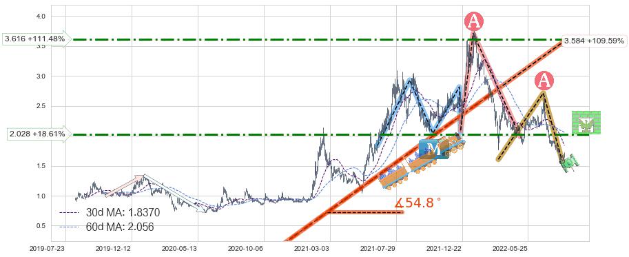 ♘ 阻力价格位2.028,可信任强度61.32%,距离最后交易2022-08-12形成的收盘价格1.7100相差 +18.61%