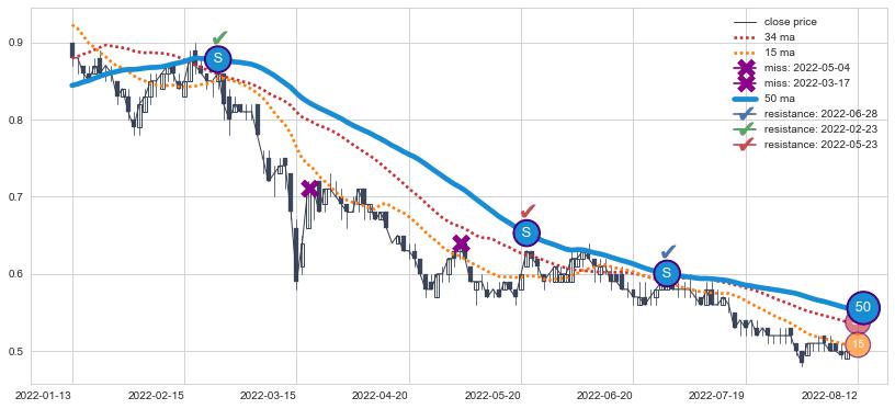 ➣ 21小时均线于(2022-06-28: 0.5957)形成【死叉】基于【死叉历史模型】预测死叉后最低波谷价格: 0.5624, 死叉后最低价格0.48500,已经下跌超出预测最低波谷价格, 预期反弹