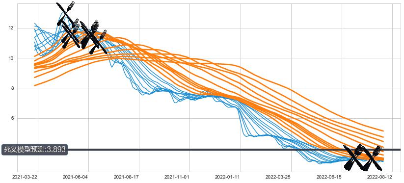 ➢ 120小时均线于(2021-06-18: 11.00)形成【死叉】基于【死叉历史模型】预测死叉后最低波谷价格: 9.75, 死叉后最低价格2.920,已经下跌超出预测最低波谷价格, 预期反弹