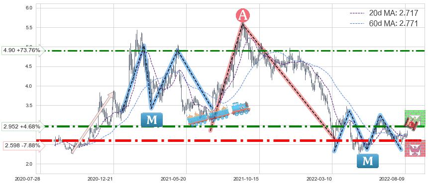 ♘ 阻力价格位2.952,可信任强度71.27%,距离最后交易2022-08-12形成的收盘价格2.820相差 +4.68%