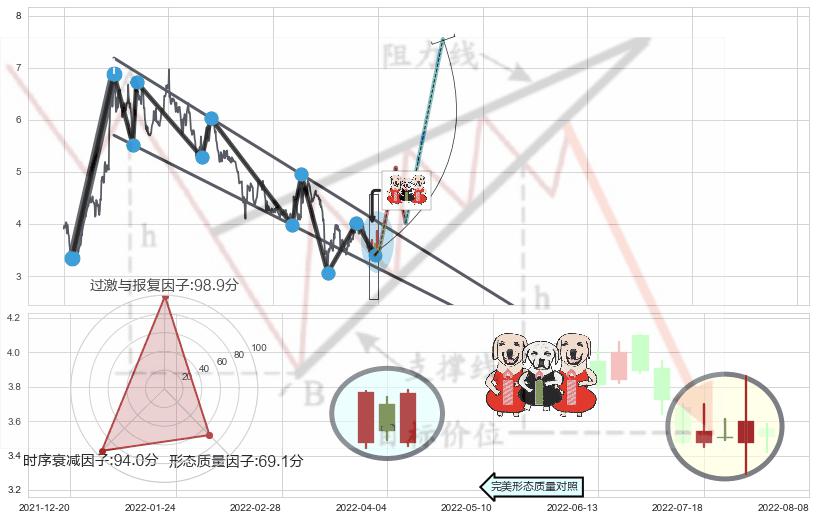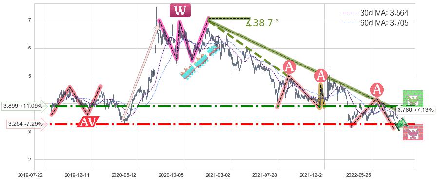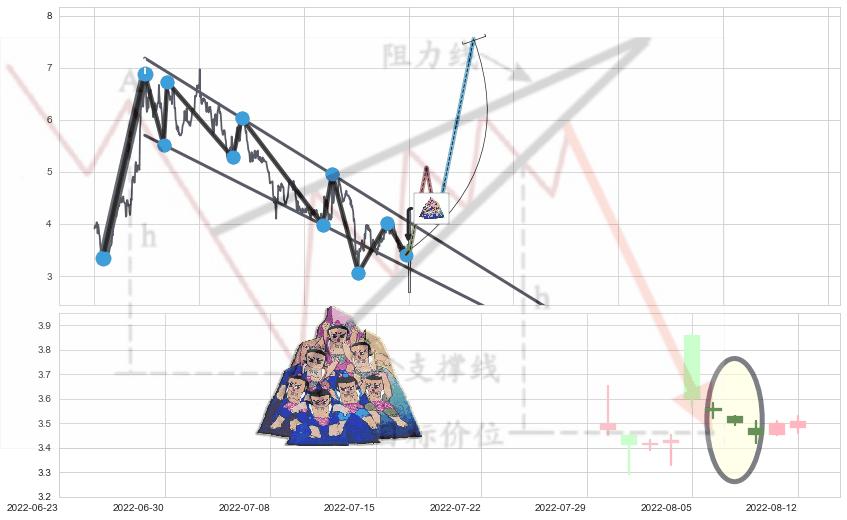 ♘ 阻力价格位3.899,可信任强度83.67%,距离最后交易2022-08-12形成的收盘价格3.510相差 +11.09%