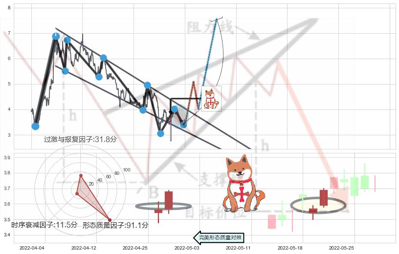 ➣ 上涨孕十字星 + 降楔型临近阻力猜想转换支撑上涨信号叠加后【目标达成率】中等,【看多】信号叠加【存续影响中等】