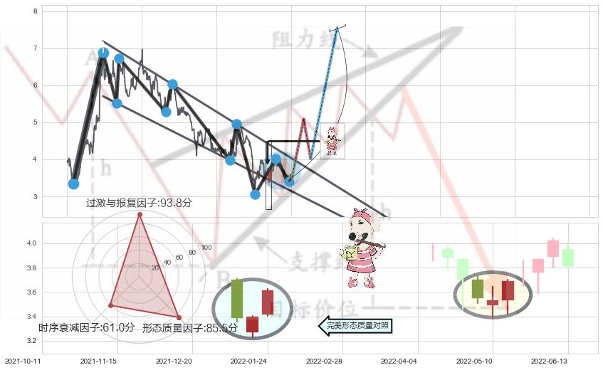 ➣ 早晨之星(黎明之星) + 降楔型临近阻力猜想转换支撑上涨信号叠加后【目标达成率】中等,【看多】信号叠加【存续影响中等】