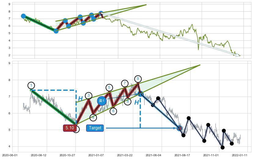 ➢ 最小中继整理跌幅→𝐇: 2.070 (𝐇楔型旗杆的长度:楔型起点→顶点)