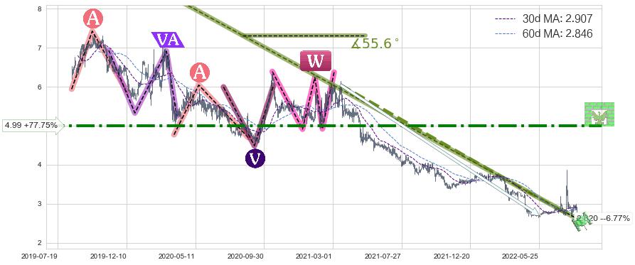 ♘ 阻力价格位4.99,可信任强度73.41%,距离最后交易2022-08-12形成的收盘价格2.810相差 +77.75%