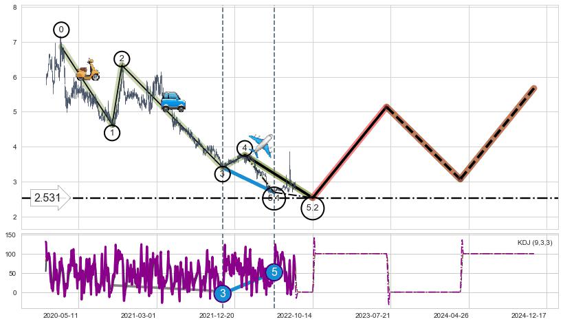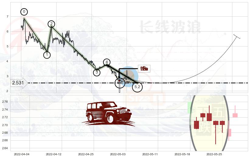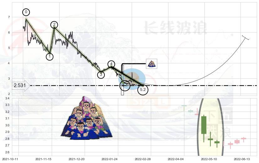 ➣ 5.1: 预测当前第5浪位置(2022-05-26, 2.690),仍然有下跌空间