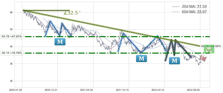 ♘ 阻力价格位45.78,可信任强度84.97%,距离最后交易2022-08-12形成的收盘价格30.95相差 +47.91%