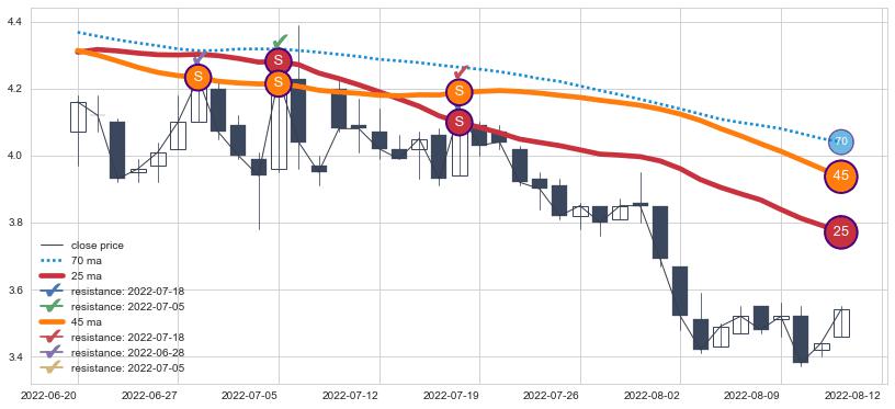 ➣ 30小时均线于(2022-06-15: 4.26)形成【死叉】基于【死叉历史模型】预测死叉后最低波谷价格: 3.976, 死叉后最低价格3.380,已经下跌超出预测最低波谷价格, 预期反弹
