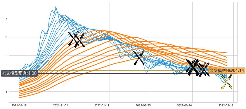 ➣ 40小时均线于(2022-07-05: 4.20)形成【死叉】基于【死叉历史模型】预测死叉后最低波谷价格: 3.838, 死叉后最低价格3.380,已经下跌超出预测最低波谷价格, 预期反弹