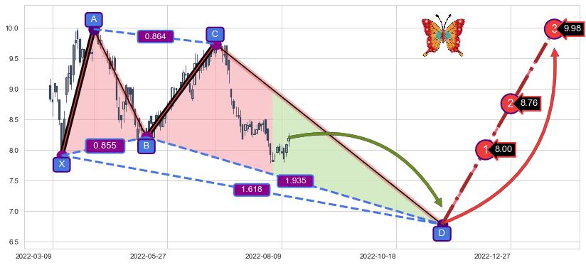 ➣ 未完成【蝴蝶】形态起点X: 2022-03-15, 已到达C点: 2022-06-28, 预测最终D点: 2022-11-15, 共160交易日