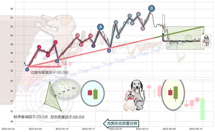 ➣ 2021-10-11-2022-05-23上升趋势存在反转[风险],其原上升趋势的支撑位(51.98)已破位[强阻力信号],原上升趋势角度: 34.0˚
