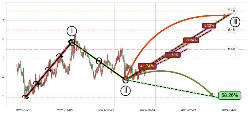 ➣ 调整浪已超过预测的c点位置,但后续大趋势循环浪高概率反转下跌,继续上涨概率41.74%,谨慎做多