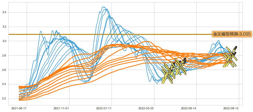 ➣ 21小时均线于(2022-08-11: 2.822)形成【金叉】基于【金叉历史模型】预测金叉后最高波峰价格: 3.104, 金叉后最高价格2.960,尚未达到预测最高波峰价格, 预期继续上涨