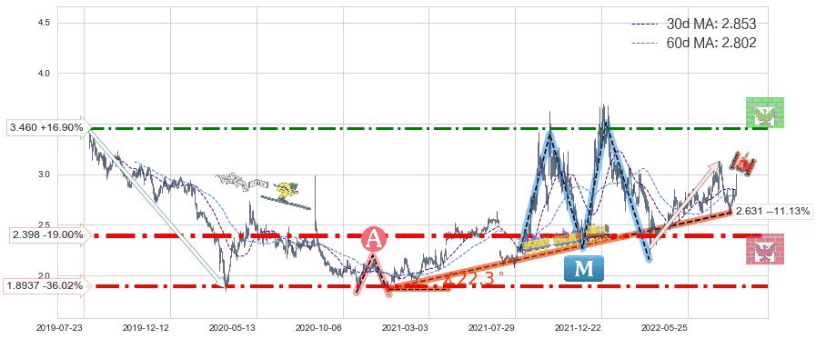 ♘ 阻力价格位3.460,可信任强度61.30%,距离最后交易2022-08-12形成的收盘价格2.960相差 +16.90%