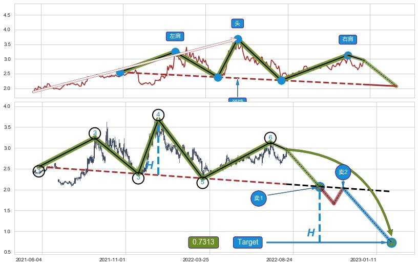 ➢ 头肩顶:猜想临近关键支撑位突破点 → 临近拐点下跌 → 风险信号 → 大趋势均值回复