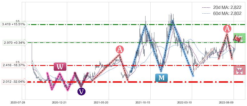 ♘ 阻力价格位3.419,可信任强度56.91%,距离最后交易2022-08-12形成的收盘价格2.960相差 +15.51%