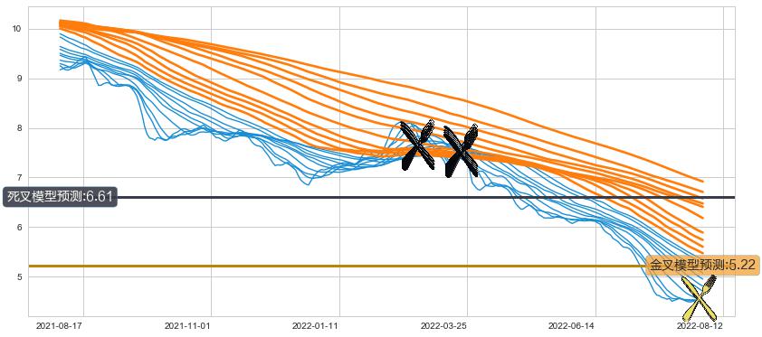 ➣ 60小时均线于(2022-03-22: 7.51)形成【死叉】基于【死叉历史模型】预测死叉后最低波谷价格: 6.60, 死叉后最低价格4.40,已经下跌超出预测最低波谷价格, 预期反弹