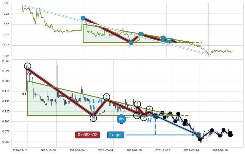 ➢ 【多方力量耗尽,空方打破攻守平衡点】下降三角形中继整理, 已在2021-09-23突破【支撑】颈线 0.114000 →演变成下降通道