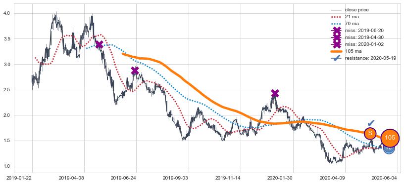 ➢ 最优均线组合共正确确认支撑阻力信号10处,正确确认率 71.43%