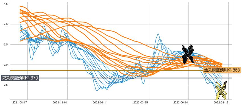 ➣ 60小时均线于(2022-06-13: 3.214)形成【死叉】基于【死叉历史模型】预测死叉后最低波谷价格: 2.761, 死叉后最低价格2.220,已经下跌超出预测最低波谷价格, 预期反弹