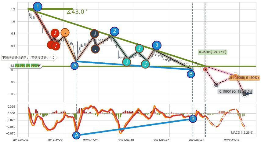 ♘ 在最后的下跌阶段2019-05-09至2022-04-21,存在 持续未破位的阻力位 ,阻力价格0.26201,可信任强度86.72%,其距离最后价格0.210000相差 +24.77%